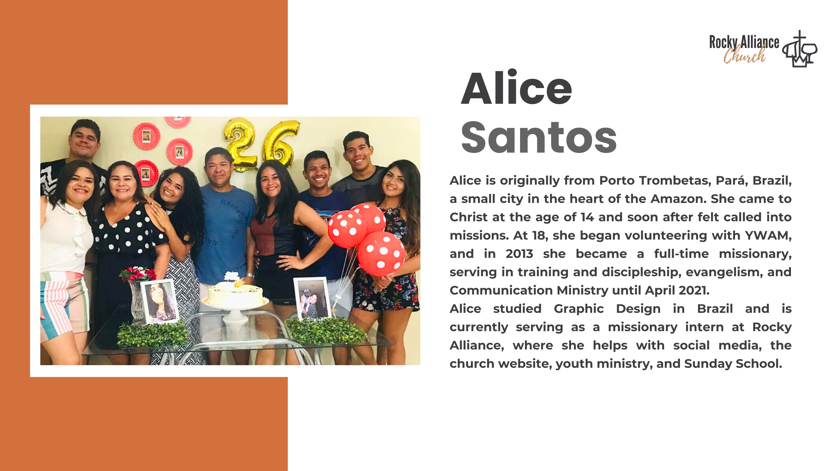 Alice is serving Rocky Alliance as a Missionary Intern. She is using her social media and graphic design experience to help improve the church's social media and website platforms.