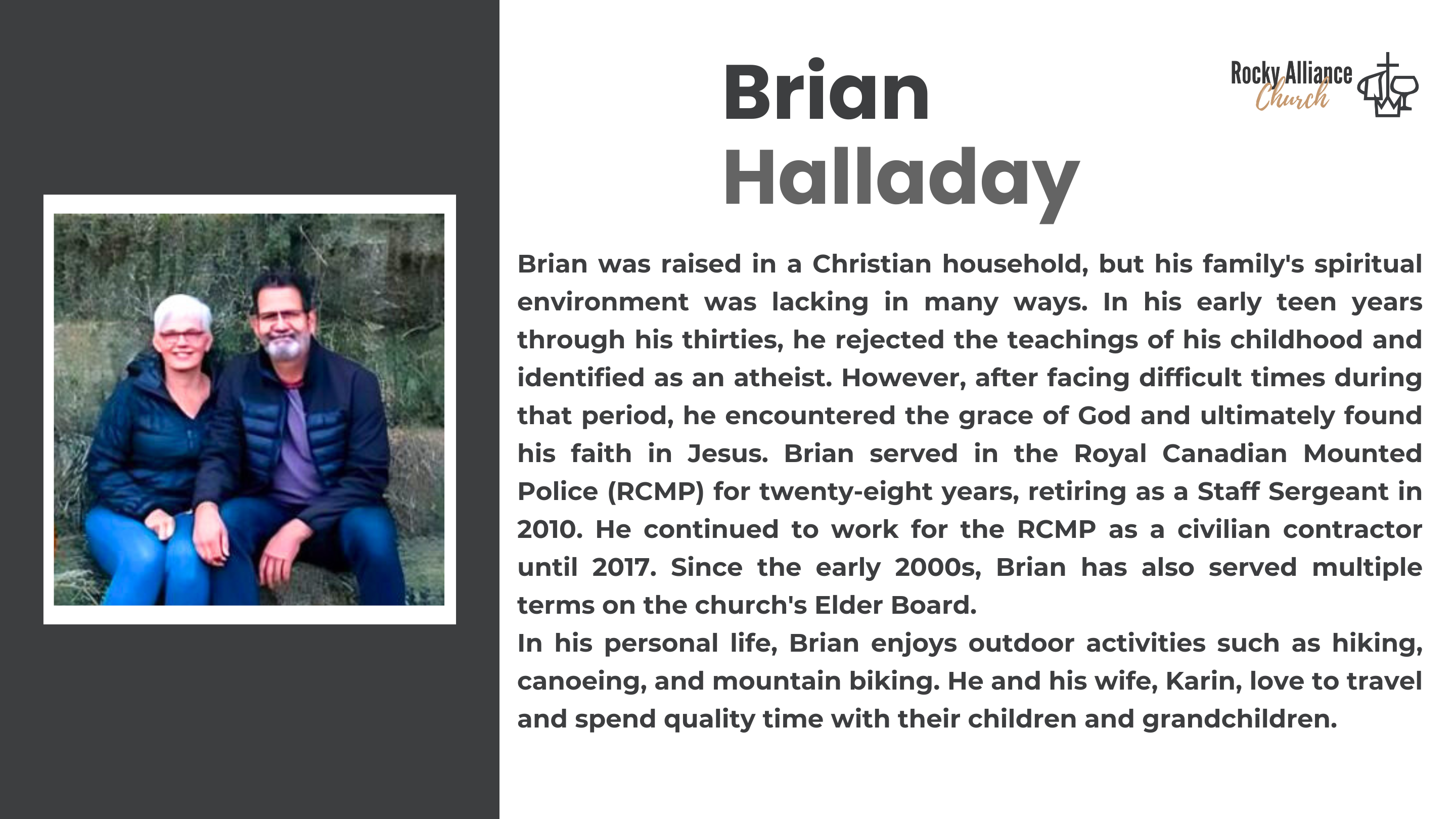 Brian serves as an Elder at Rocky Alliance. The Elder Board's primary responsibilities include overseeing the spiritual health of the local church and providing pastoral care to the congregation. Additionally, we are entrusted with managing the necessary business and legal requirements applicable to a registered charitable organization in Canada.