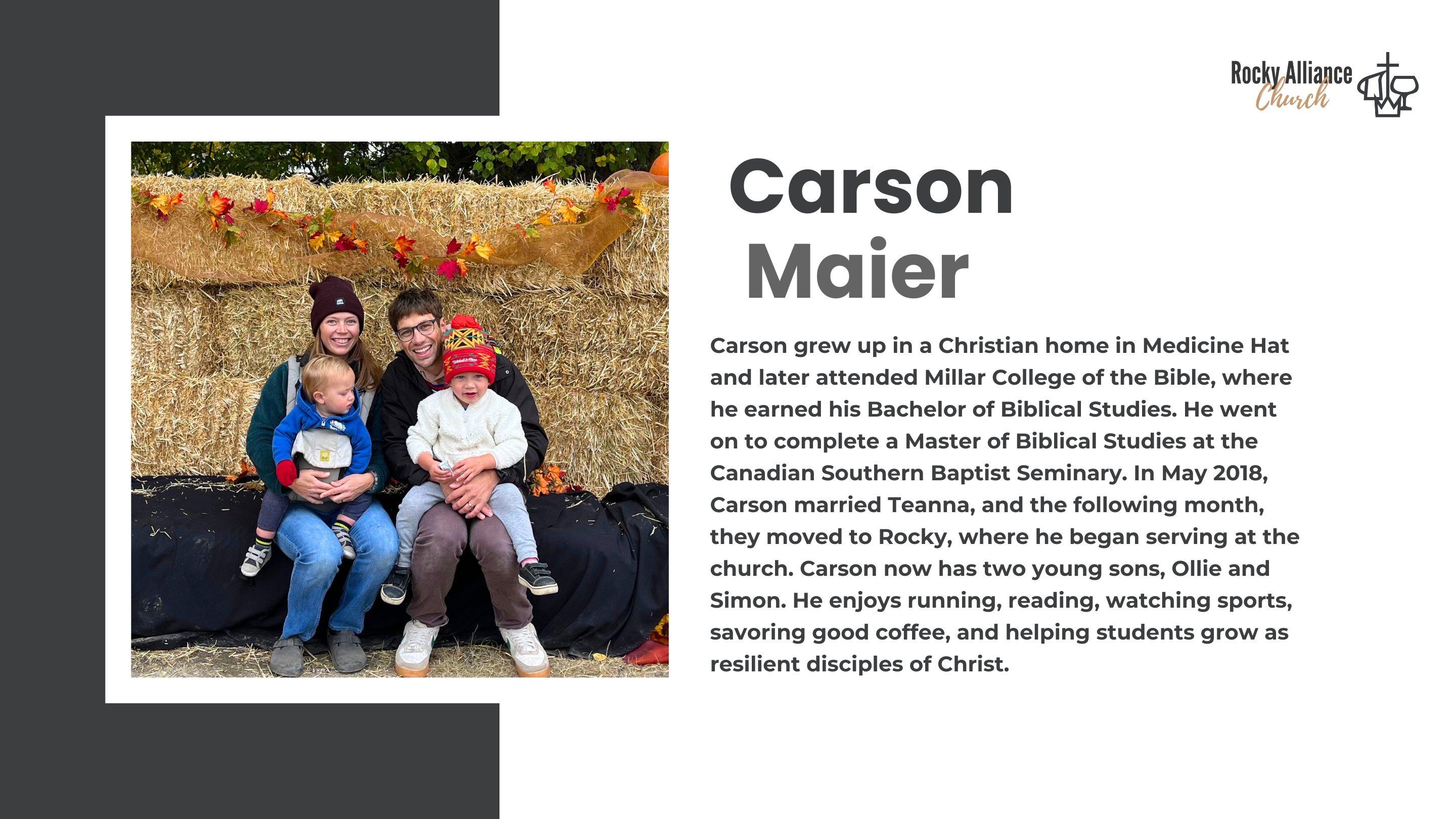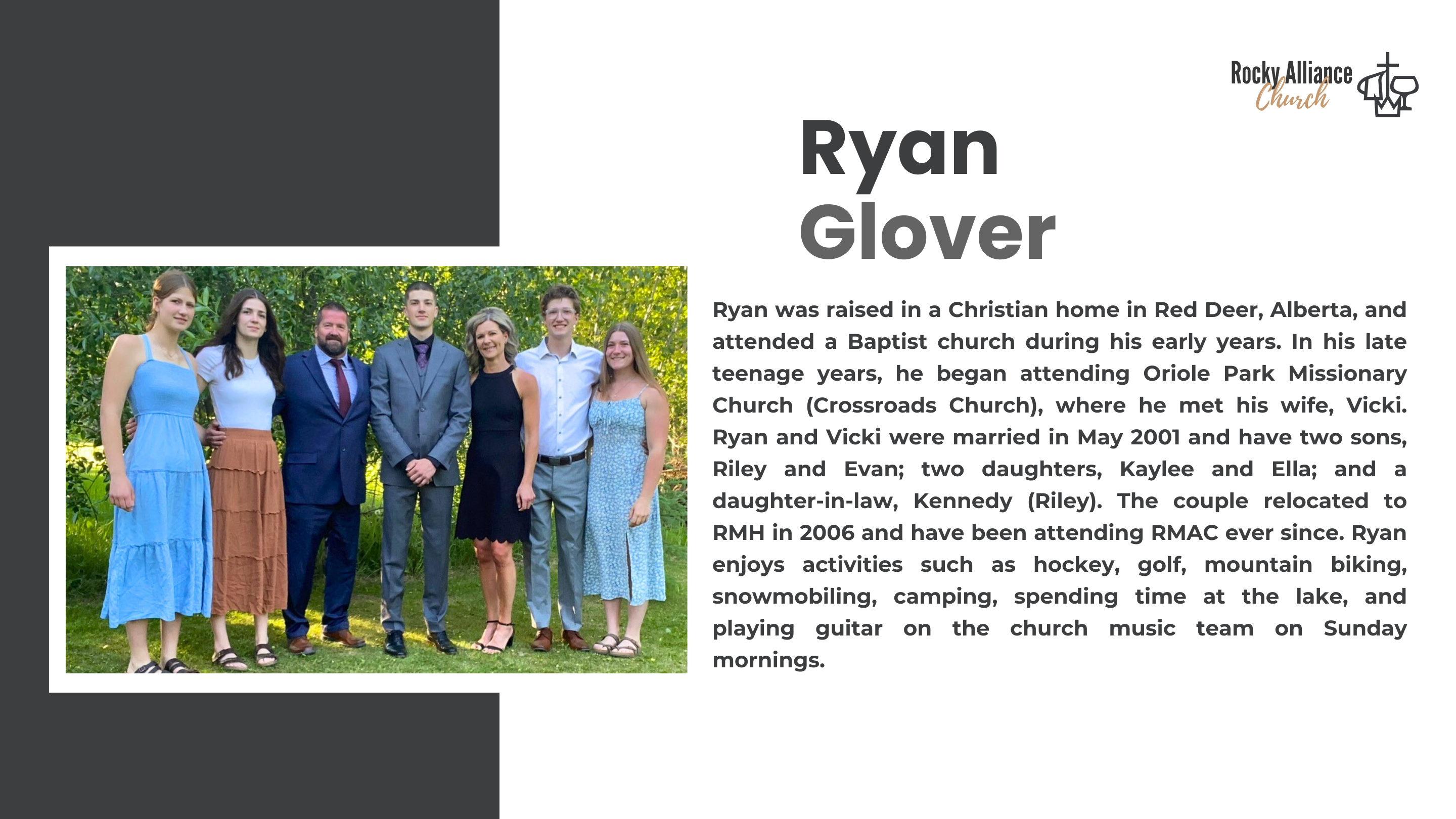 Ryan serves as an Elder at Rocky Alliance. The Elder Board's primary responsibilities include overseeing the spiritual health of the local church and providing pastoral care to the congregation and the Music Ministry Leader at Rocky Alliance Church. Additionally, we are entrusted with managing the necessary business and legal requirements applicable to a registered charitable organization in Canada.