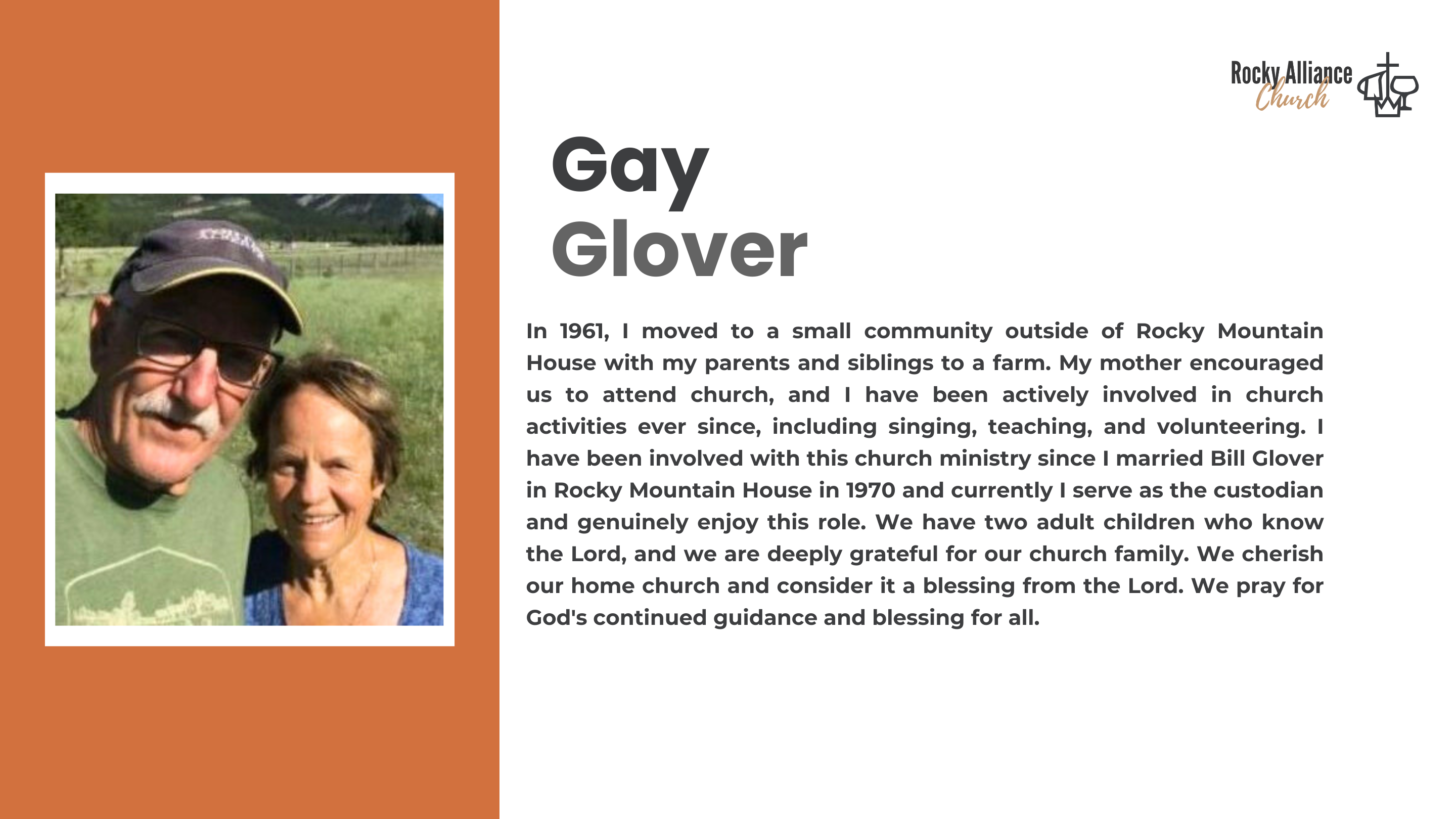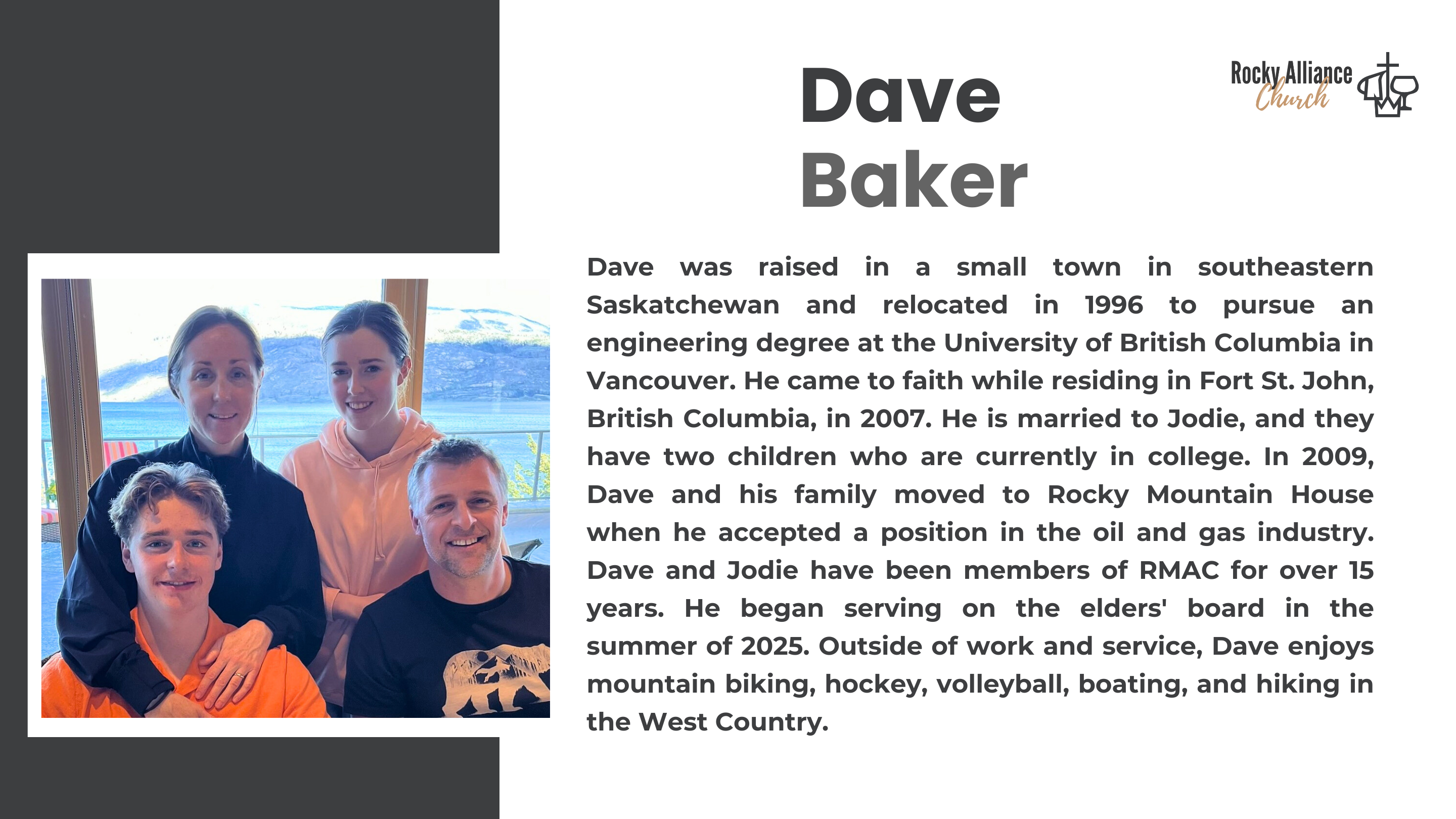 Dave serves as an Elder at Rocky Alliance. The Elder Board's primary responsibilities include overseeing the spiritual health of the local church and providing pastoral care to the congregation. Additionally, we are entrusted with managing the necessary business and legal requirements applicable to a registered charitable organization in Canada.